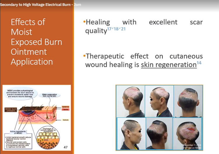在口頭演講版塊,共有3名醫(yī)生帶來了針對濕潤燒傷膏的臨床應用經(jīng)驗分享。首先,來自菲律賓達沃醫(yī)學中心的James Paul Dumdum醫(yī)生帶來了題為《濕潤燒傷膏用于治療高壓電燒傷導致的頭皮缺損》(Use of Moist Exposed Burn Ointment on a Scalp Defect Secondary to High Voltage Electrical Burn)的演講,他分享的是一例全層頭皮缺損患者應用濕潤燒傷膏治療的完整過程。
