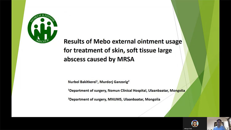 另一位講者,是來自蒙古Nomun臨床醫(yī)院的Nurbol Bakhytkyeryei醫(yī)生,他的演講題目為《濕潤燒傷膏治療耐甲氧西林金黃色葡萄球菌感染膿腫》(Results of Moist Exposed Burn Ointment Usage for Treatment of Large Abscess Caused by MRSA)。在演講中,他分享了一例大面積感染壞死患者的治療,全程應用濕潤暴露療法,創(chuàng)面愈合后未產(chǎn)生瘢痕,且肢體功能恢復良好。