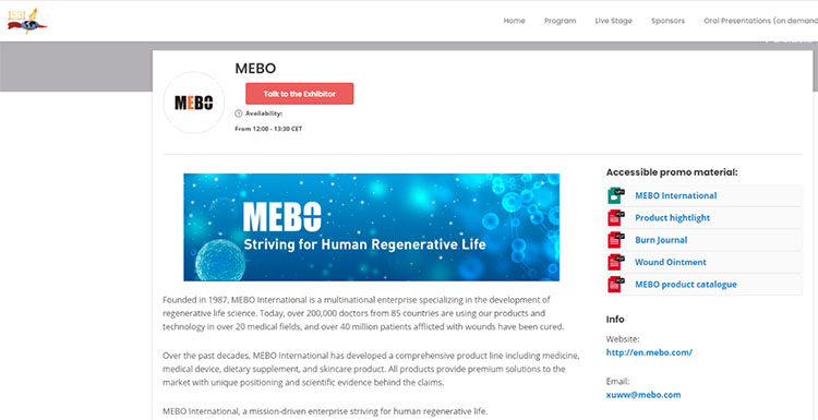 自2010年以來,美寶國際已經(jīng)連續(xù)參加了6屆ISBI大會,是ISBI最重要的合作伙伴之一。繼2016年和2018年連續(xù)2屆成為ISBI大會最高級別贊助商后,美寶國際今年再次成為ISBI大會的最大贊助商之一。此次大會上,美寶國際精心設計了電子展臺,力求從多方面向參會者展示企業(yè)風采。展臺上不僅展示了濕潤燒傷膏、疤痕軟膏、創(chuàng)瘍貼等已在全球應用數(shù)十年的核心產(chǎn)品,還同時與全球專家分享了濕潤燒傷膏治療燒傷的最新臨床研究進展。