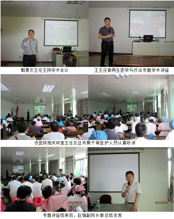 2013年12月6日上午8時(shí),中國(guó)燒傷創(chuàng)瘍雜志副總編輯、中國(guó)中西醫(yī)結(jié)合學(xué)會(huì)燒傷專業(yè)委員會(huì)常委兼秘書、北京美寶燒傷創(chuàng)瘍研究所副所長(zhǎng)、臨床研究部主任王洪生研究員應(yīng)邀來到臺(tái)山市中醫(yī)院外科病房,在科主任和主管醫(yī)生的陪同下對(duì)多例創(chuàng)傷潰瘍、糖尿病足、靜脈淤血性潰瘍、皮膚癌、褥瘡、手術(shù)切口感染等住院患者進(jìn)行會(huì)診及教學(xué)查房。9點(diǎn)10分,來到門診大廳,開展專家義診活動(dòng)。11點(diǎn)左右,王主任不辭辛苦,在科主任和業(yè)務(wù)院長(zhǎng)的陪同下再次來到外科病房,對(duì)兩例典型病例患者做教學(xué)式清創(chuàng)換藥。下午3點(diǎn),在該醫(yī)院學(xué)術(shù)會(huì)議廳再次舉辦了臺(tái)山市“皮膚再生醫(yī)療技術(shù)在慢性難愈性創(chuàng)面創(chuàng)面治療新進(jìn)展”專題講座,學(xué)術(shù)講座開始后,首先由該醫(yī)院創(chuàng)瘍血管外科主管醫(yī)生陳強(qiáng)做了“皮膚再生醫(yī)療技術(shù)在中醫(yī)院臨床運(yùn)用實(shí)踐和體會(huì)”的講座,隨后王主任做了專題為“皮膚再生醫(yī)療技術(shù)在慢性創(chuàng)瘍創(chuàng)面治療新進(jìn)展”的學(xué)術(shù)報(bào)告。會(huì)議由外科甑主任和趙付院長(zhǎng)主持,中醫(yī)院及臺(tái)山各鄉(xiāng)鎮(zhèn)醫(yī)院領(lǐng)導(dǎo)和相關(guān)科室骨干150多名醫(yī)護(hù)人員參加了學(xué)術(shù)講座。王主任重點(diǎn)講述了1,我國(guó)著名生命科學(xué)家、醫(yī)學(xué)家徐榮祥教授近年來在人體再生復(fù)原科學(xué)研究領(lǐng)域所取得的重大臨床及實(shí)驗(yàn)研究成果,以及再生復(fù)原療法的概念及其解決難愈性創(chuàng)面治療的機(jī)理;2,介紹了再生復(fù)原療法創(chuàng)面規(guī)范的處理方法 ;3,重點(diǎn)講述了再生復(fù)原療法在各類難愈性創(chuàng)瘍創(chuàng)面治療要點(diǎn)及典型病例介紹,并結(jié)合大量的病例圖片講解了各類深度燒傷創(chuàng)面、再生醫(yī)療技術(shù)在骨外露、鋼板外露、糖尿病足、動(dòng)脈閉塞癥、撕脫傷、斷肢再生、手術(shù)切口感染、褥瘡等各種難愈合創(chuàng)面的治療過程及要點(diǎn)。學(xué)術(shù)報(bào)告持續(xù)到6點(diǎn)才結(jié)束。學(xué)術(shù)講座結(jié)束后,主管副院長(zhǎng)趙強(qiáng)做了總結(jié)發(fā)言,會(huì)后,該醫(yī)院院長(zhǎng)陳誼武親自到會(huì)對(duì)王主任表示感謝,他還特別強(qiáng)調(diào),2003年他曾經(jīng)到廣州參加皮膚再生醫(yī)療技術(shù)學(xué)習(xí)班,今天聽到的和看到的是該項(xiàng)技術(shù)又在慢性難愈性創(chuàng)面有了那么多新進(jìn)展,本次學(xué)術(shù)交流非常有意義,之后王主任應(yīng)邀與陳誼武、院長(zhǎng)、趙強(qiáng)副院長(zhǎng)、創(chuàng)瘍血管外科主任甄景志等領(lǐng)導(dǎo)、專家合影留念。通過本次,義診、教學(xué)查房、會(huì)診、學(xué)術(shù)講座臺(tái)山市電視臺(tái)等新聞媒體全程進(jìn)行了采訪報(bào)道,起到了在臺(tái)山市進(jìn)一步深入推廣、普及皮膚再生醫(yī)療技術(shù)的作用。