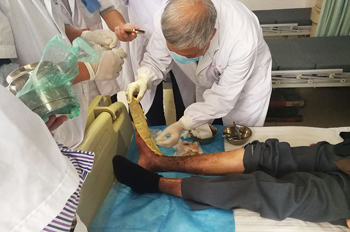 9月25日,中國(guó)中西醫(yī)結(jié)合學(xué)會(huì)燒傷專(zhuān)業(yè)委員會(huì)金黨軍教授來(lái)到黃岡市中心醫(yī)院腫瘤科,對(duì)該科骶尾部壓瘡患者進(jìn)會(huì)診,該科護(hù)士長(zhǎng)尹志紅將患者情況與金教授進(jìn)行了交流,同時(shí)金教授對(duì)整個(gè)換藥流程進(jìn)行示范演示。換藥后金教授與護(hù)士長(zhǎng)等人對(duì)再生技術(shù)進(jìn)行了更深入交流探討,為今后再生技術(shù)在該科室更好推廣奠定基礎(chǔ)。