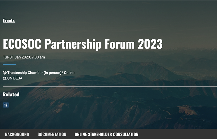 聯(lián)合國經(jīng)濟及社會理事會(ECOSOC)2023年伙伴關(guān)系論壇將于美東時間2023年1月在紐約聯(lián)合國總部舉行,而基于 “加快新冠疫情(COVID-19)后修復(fù),全面落實2030年可持續(xù)發(fā)展議程”的目標,聯(lián)合國經(jīng)濟及社會理事會旨在通過匯集聯(lián)合國各成員國和利益攸關(guān)方——包括國際組織、地方政府、非政府組織、私營部門、民間社團以及科學(xué)家、學(xué)術(shù)界、婦女、青年等——以創(chuàng)新方式,推動聯(lián)合國可持續(xù)發(fā)展目標(SDGs)的實現(xiàn),并特別強調(diào)伙伴關(guān)系在這方面可發(fā)揮的重要作用。