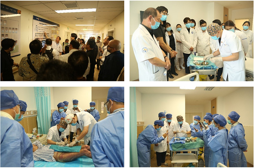 9日下午及10日,訪(fǎng)問(wèn)團(tuán)來(lái)到西安市第九醫(yī)院的燒傷整形美容科進(jìn)行學(xué)術(shù)交流及病區(qū)參觀(guān)。交流過(guò)程中,來(lái)自科室的張麗醫(yī)生率先分享了關(guān)于再生醫(yī)療技術(shù)治療大面積燒傷患者的治療原則。隨后,安鴻肇、劉嘉銘、趙彬宏醫(yī)生分別講解了該技術(shù)在治療糖尿病足、壞死性筋膜炎及壓瘡的應(yīng)用。在10日的交流過(guò)程中,科室主任肖厚安首先介紹了科室歷史及與再生醫(yī)療技術(shù)的淵源并分享了應(yīng)用該技術(shù)治療慢性難愈合創(chuàng)面的寶貴經(jīng)驗(yàn)。隨后,訪(fǎng)問(wèn)團(tuán)一行在科室主任周小茜的講解下觀(guān)摩了床旁應(yīng)用再生醫(yī)療技術(shù)聯(lián)合自體微粒皮漿肉芽創(chuàng)面種植治療燒傷患者的操作。周小茜主任詳細(xì)解釋了取皮及植皮過(guò)程中的操作要點(diǎn)及換藥過(guò)程中的注意事項(xiàng)。講解過(guò)程中,訪(fǎng)問(wèn)團(tuán)就應(yīng)用再生醫(yī)療技術(shù)進(jìn)行換藥時(shí)的藥紗制備、換藥頻率、預(yù)后效果進(jìn)行了積極的討論并表現(xiàn)出對(duì)該種治療方式的濃厚興趣。