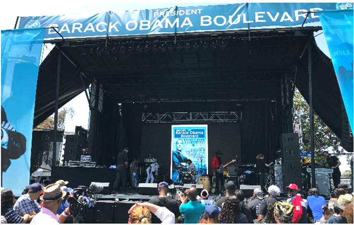 下午5點半,洛杉磯市長埃里克·加切蒂和洛杉磯市議會主席赫布·韋森率領(lǐng)一眾市議員在主席臺上正式宣布羅德奧路改名為奧巴馬大道并為新街牌揭幕。
