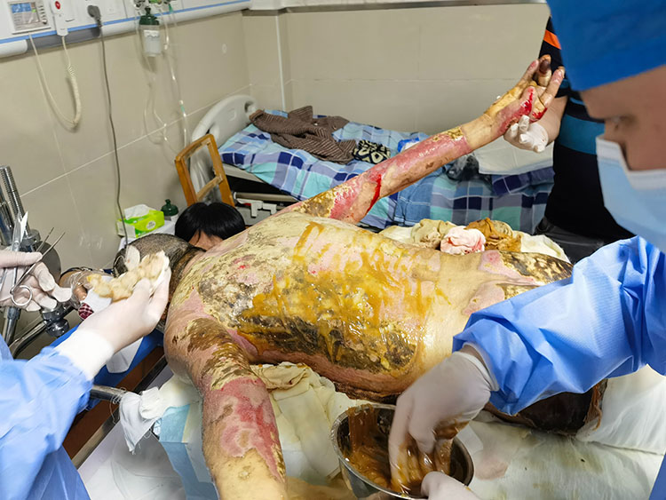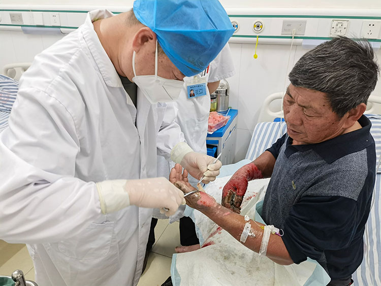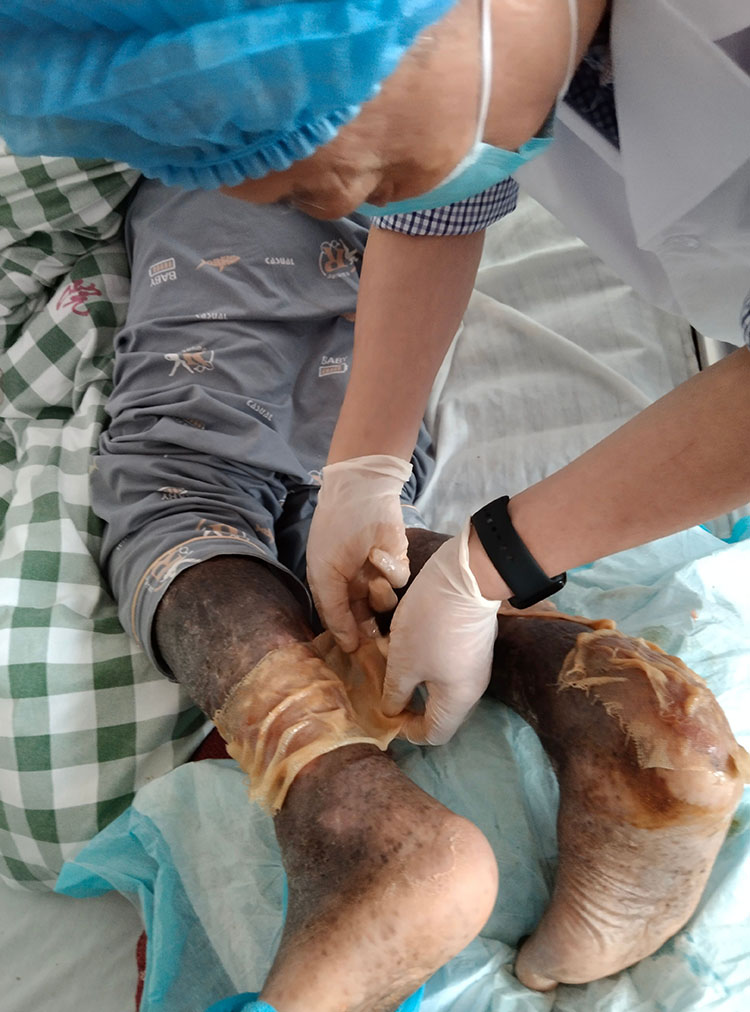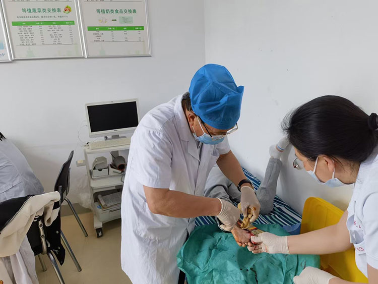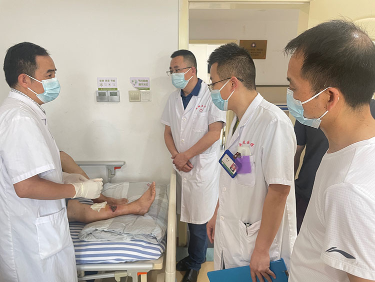 2023年5月22-23日,中國(guó)中西醫(yī)結(jié)合學(xué)會(huì)燒傷專(zhuān)業(yè)委員會(huì)醫(yī)療部張強(qiáng)主任應(yīng)邀前往寧國(guó)市人民醫(yī)院,會(huì)診了多例燒傷燙傷病人,對(duì)一例足部三度燙傷病人進(jìn)行剝痂清創(chuàng),示范再生醫(yī)療技術(shù)規(guī)范換藥及創(chuàng)面處理,和臨床醫(yī)生交流指導(dǎo),對(duì)不同創(chuàng)面的后期治療提出了寶貴意見(jiàn)。