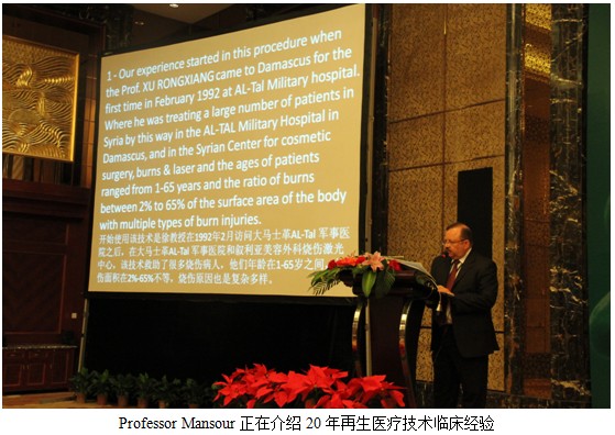 來(lái)自敘利亞整形修復(fù)外科中心主任醫(yī)學(xué)博士、整形修復(fù)外科醫(yī)生Adham MANSOUR醫(yī)生與1992年開始接觸再生醫(yī)療技術(shù),至今已經(jīng)有20余年再生醫(yī)療技術(shù)臨床經(jīng)驗(yàn)。自從1992徐教授到敘利亞訪問后,Dr. Mansour 就對(duì)再生醫(yī)療技術(shù)產(chǎn)生了濃厚的興趣并開始嘗試使用該技術(shù)治療燒傷病人。在成功救治了無(wú)數(shù)不同面積類型燒傷患者后,他又大膽嘗試將該技術(shù)應(yīng)用于其他創(chuàng)面。經(jīng)過20多年的臨床應(yīng)用,他已經(jīng)成功的將再生醫(yī)療技術(shù)應(yīng)用于各類型燒傷創(chuàng)面,激光美容創(chuàng)面,整形創(chuàng)面等并通過大量鮮明的治療前后對(duì)比照片展示了再生醫(yī)療技術(shù)的優(yōu)越性,現(xiàn)場(chǎng)代表無(wú)不折服。