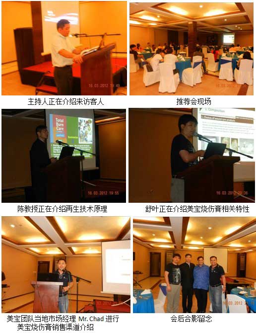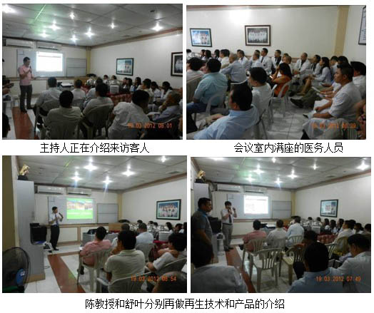 2012年3月15日早上10點(diǎn),在當(dāng)?shù)厝藛T帶領(lǐng)下,美寶團(tuán)隊(duì)走訪了Cebu城市幾個(gè)大型的政府或私立醫(yī)院,這幾家大型醫(yī)院正在嘗試使用再生技術(shù)和產(chǎn)品。其中,Dr. Mirela是重點(diǎn)培養(yǎng)的醫(yī)生,她是當(dāng)?shù)谻ebu City Medical Center(宿務(wù)市醫(yī)療中心)主管院長(zhǎng),她于去年6月到四川學(xué)習(xí)再生醫(yī)療技術(shù)兩周時(shí)間,深入了解到再生療法在中國(guó)的使用情況并學(xué)到了純正的再生技術(shù)。回國(guó)后,她積極致力于再生技術(shù)在當(dāng)?shù)氐氖褂?。通過(guò)她個(gè)人的影響力安排中國(guó)專家在當(dāng)?shù)卣瓮饪评龝?huì)上正式推廣再生技術(shù)及產(chǎn)品。晚上7:40,宿務(wù)整形外科例會(huì)按時(shí)召開(kāi),當(dāng)?shù)馗骷?jí)別整形醫(yī)生共計(jì)44人參加了此次例會(huì)。陳永翀教授為大家講授再生醫(yī)學(xué)臨床使用方法,舒葉介紹美寶燒傷膏產(chǎn)品知識(shí),整個(gè)例會(huì)持續(xù)了近3個(gè)小時(shí)。在最后的提問(wèn)環(huán)節(jié),與會(huì)醫(yī)生就再生醫(yī)學(xué)相關(guān)問(wèn)題同美寶團(tuán)隊(duì)成員進(jìn)行了深入的交流。最后Dr. Mirela總結(jié)說(shuō),她非常感謝中國(guó)客人的到來(lái),但更要感謝的是帶來(lái)了這么完美的技術(shù),她本人在中國(guó)學(xué)習(xí)了兩周,親眼見(jiàn)證了再生技術(shù)在中國(guó)的神奇應(yīng)用,現(xiàn)在有很多她的病人都在這項(xiàng)技術(shù)的幫助下康復(fù),非常感激那次的學(xué)習(xí)旅程,使她見(jiàn)識(shí)到了不僅中國(guó)人的熱情還有中華民族強(qiáng)大的醫(yī)學(xué)文化底蘊(yùn)。