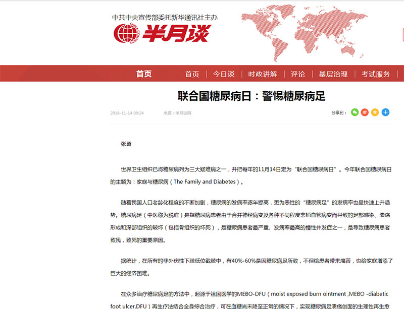 2018年11月14日,聯(lián)合國糖尿病日,中央級新聞媒體“半月談”在其網(wǎng)站健康欄目首頁刊發(fā)中國中西醫(yī)結(jié)合學(xué)會燒傷專委會常務(wù)委員、《中國燒傷創(chuàng)瘍》雜志編輯委員會常務(wù)委員張勇撰寫的“聯(lián)合國糖尿病日:警惕糖尿病足”一文。