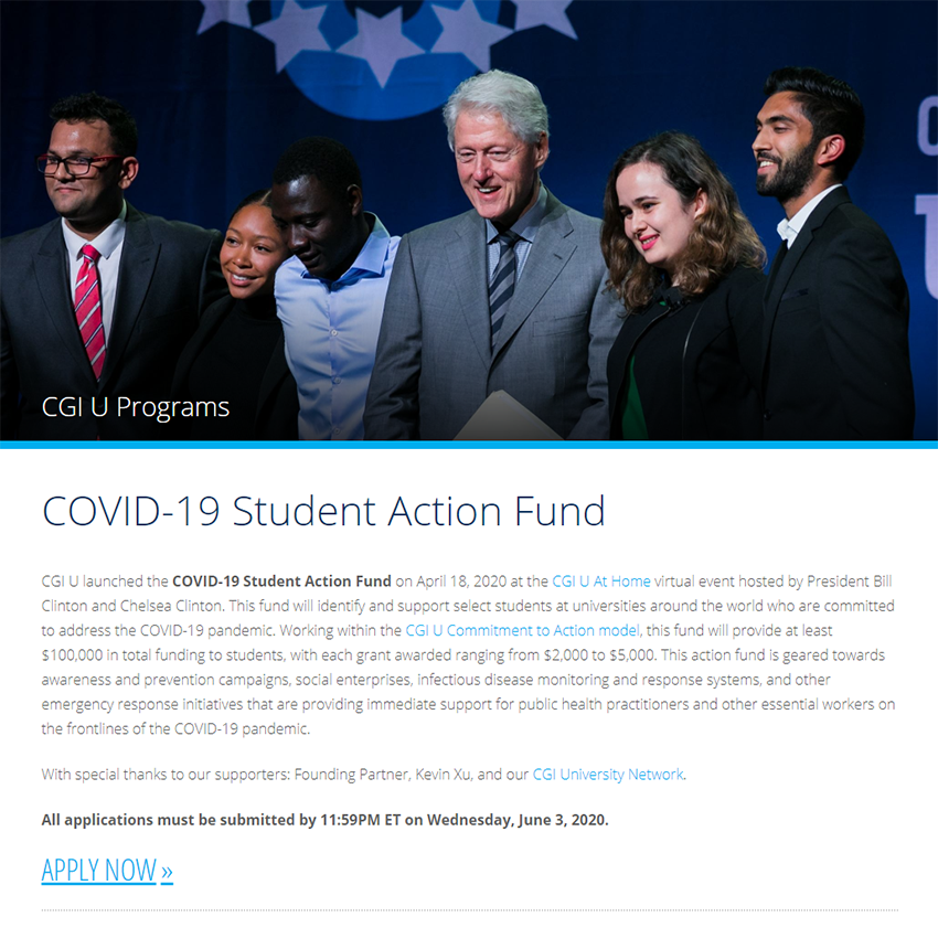 2020年美東時間4月18日,美寶集團董事局主席徐鵬聯(lián)合克林頓在克林頓全球倡議大學(xué)(CGIU)宣布發(fā)起“ 新冠病毒學(xué)生行動基金”(COVID-19 Student Action Fund)。目前,這項用于激勵與支持致力于解決新型冠狀病毒(COVID-19)危機的世界各地的大學(xué)生的基金的申請行動已經(jīng)開始。