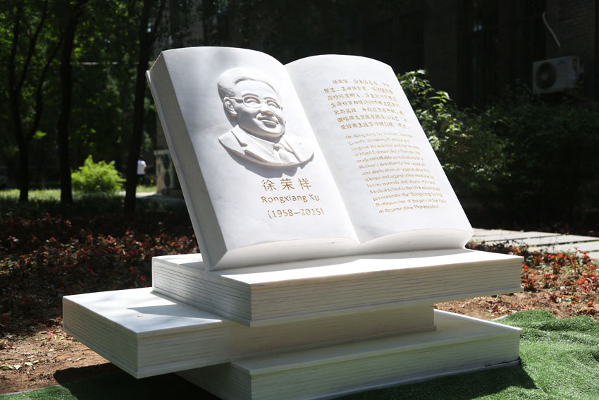 “榮祥樓”牌匾由中國(guó)傳統(tǒng)工藝景泰藍(lán)精制而成,徐榮祥教授紀(jì)念刻石則由通體漢白玉雕刻而成,碑書(shū)內(nèi)容中英文金字鑲刻,高度概括了徐榮祥教授的一生:徐榮祥,山東沾化人,外科醫(yī)生、生命科學(xué)家,燒傷濕潤(rùn)暴露療法發(fā)明人。畢生致力于再生生命科學(xué)和燒傷創(chuàng)瘍?cè)偕t(yī)學(xué)研究與實(shí)踐,并做出杰出貢獻(xiàn)。美國(guó)哈佛大學(xué)醫(yī)學(xué)院永久設(shè)立“徐榮祥再生醫(yī)學(xué)外科教授”席位。