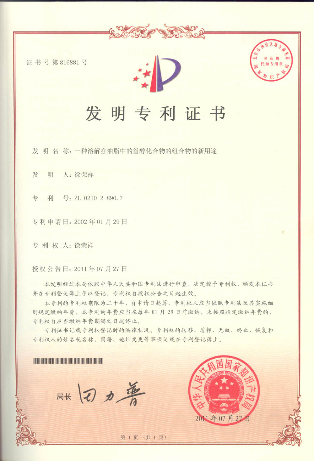 | ZL02102890.7 | 一種溶解在油脂中的甾醇化合物的組合物的新用途 | 查看 |